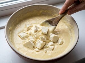 3. Incorporar el queso desmenuzado, batiendo hasta obtener una mezcla esponjosa y homogénea.