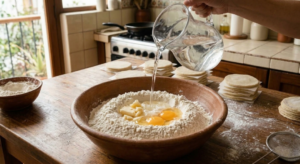 2. Incorporar el jugo de naranja, el huevo y la cantidad de agua según sea necesario y amasar hasta conseguir una masa bien sedosa.