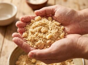 - Agregar la leche:Incorporar la leche poco a poco hasta lograr una masa suelta y granulada (no debe ser una masa líquida ni compacta).
