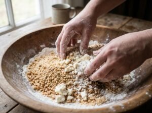 - Agregar la grasa:Agregar la manteca o grasa a temperatura ambiente. Mezclar con las manos hasta obtener una textura arenosa.