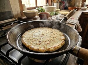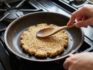 - Calentar la sartén y formar el mbeju:Usar una sartén antiadherente a fuego medio-bajo. No es necesario engrasar. Colocar una porción de la mezcla en la sartén y presionar suavemente con una cuchara o espátula formando un disco (aprox. 1 cm de grosor).