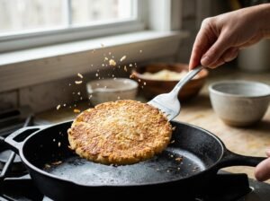 - Cocinar:Cocinar lentamente hasta que la base esté dorada y firme (unos 5–7 minutos). Dar la vuelta con cuidado.